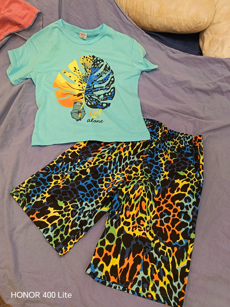 Футболка свободного кроя с модным оверсайз-силуэтом не стесняет движений и позволяет чувствовать себя максимально комфортно. Яркий набивной принт добавляет образу игривости и летнего настроения. Шорты с боковыми карманами выполнены из набивной хлопковой ткани и дополнены широким мягким поясом, который хорошо фиксируется на талии, не сползает и не пережимает животик. Высокая посадка и свободный крой обеспечивают полную свободу движений при ходьбе, играх или активном отдыхе.